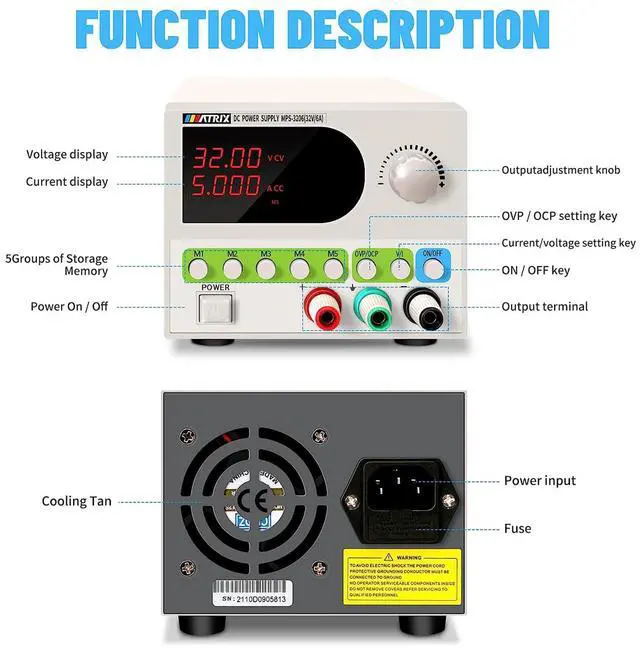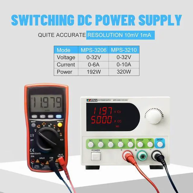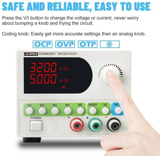 Store & Recall with Ease: MPS-3210/MPS-3206 DC power supply boasts 5 sets of storage functions. Variable DC power supply adjusts desired voltage & current effortlessly with the coding knob. Switch between voltage & current modes with the V/I key.