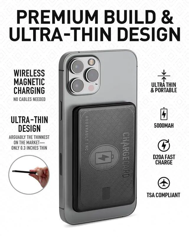 ChargeCard packs a 5000mAh Li-cobalt battery in an ultra-thin 0.3" credit card-sized body (3.75" x 2.5", 3.5oz). Delivers up to 20W fast charging with MagSafe-style magnetic snap-on design and a premium laser-etched stainless steel finish.
