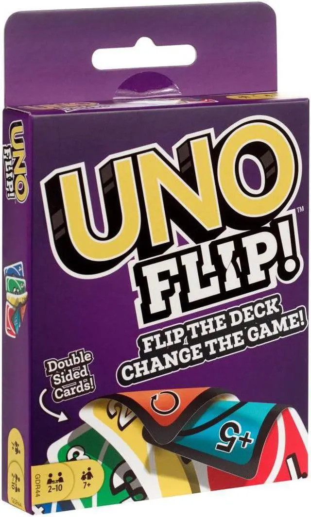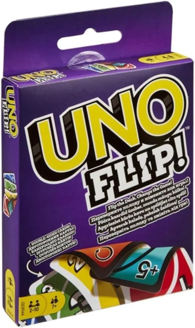 Brace yourself for the next iteration of classic UNO: UNO FLIP! It's the matching game you know, plus exciting new twists -- like a double sided deck and special FLIP card -- that give classic gameplay a competitive edge. Players take turns matching a card in their hand with the current card shown on top of the deck either by color or number. In a race to deplete their hands, players can play special cards to slow their opponents down, like Skips, Reverses and color-changing Wild cards. UNO FLIP! also includes new Action cards that really shake things up, like Draw Five and Skip Everyone cards. Play the special FLIP card and all cards in your hand, the draw pile and draw deck are flipped over to reveal an entirely new set of numbers and colors on the opposite side! The holder of the FLIP card determines whether or not you play on the "light" side or "dark" side of the deck -- and when you switch it back around. Strategize to rattle your competition and be the first to get rid of your cards to win. When you're down to one card, don't forget to shout "UNO!" Colors and decorations may vary.