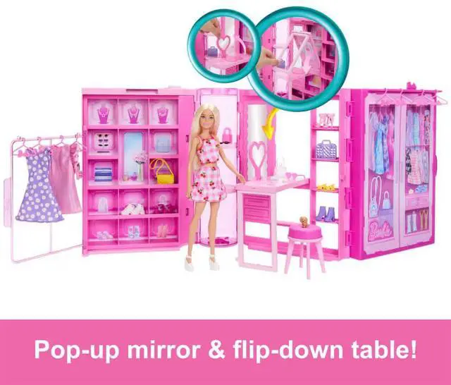 This Barbie Dream Closet is packed with endless styles and stories kids can create for Barbie! Open the glittery pink wardrobe to reveal a 3-foot-wide playset with 2 clothing racks, 20+ storage spaces, a fold-down vanity with a pop-up mirror, full-length mirror, and shoe shelf. There's even a pillow for the pet puppy! Kids will love styling the included Barbie fashion doll with 25+ clothes and accessories like dresses, shoes, necklaces, and purses galore. Mix and match 3 complete looks for Barbie to dive into styling and storytelling play! Kids can help Barbie doll choose an outfit on the rack, style and accessorize at the mirror, then finish getting ready at the vanity before she heads out in style with her pet pup for the best day ever! For easy storage, all the pieces fit inside the closet with a pink Barbie handle for on-the-go fun.
