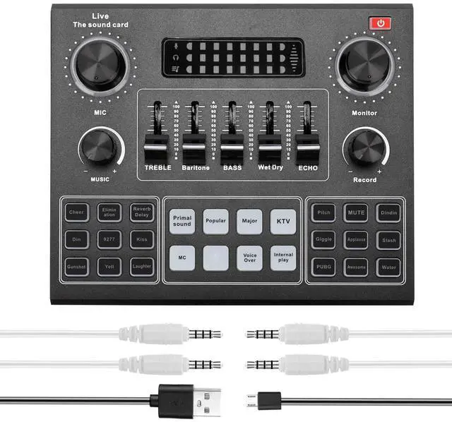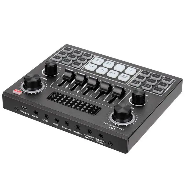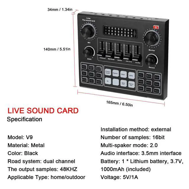 This V9 sound card adopts powerful DSP audio chip, with stable , nice sound quality and without delay. Tuning knob design, with 12 kinds of electricity sound and 14 warming up sound effects, support elimination of originalsound, live singing, one- avoidance, real-time monitoring. Multifunctional, support BT accompaniment. You can have a try.