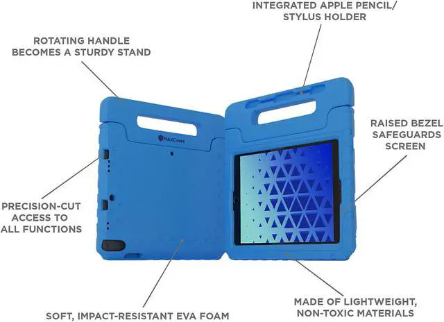 | Features | iPads put a world of learning at young one's fingertips - but only when they're safe, sound and functional. Keep kids learning by protecting yours with our versatile Shieldy-K case for the iPad Mini 6. The lightweight, impact-resistant EVA foam protects against damage from accidental drops and bumps while the raised bezel edges help safeguard the screen. Custom-designed for a perfect-fit, all openings are laser-cut and provide easy access to all controls and ports. The built-in handle rotates to become a stand for easy viewing in two different positions. The integrated holder keeps Apple Pencil or other stylus close at hand. Passes MIL-STD-810G 4-foot drop test and is made from non-toxic, kid-friendly materials. |
