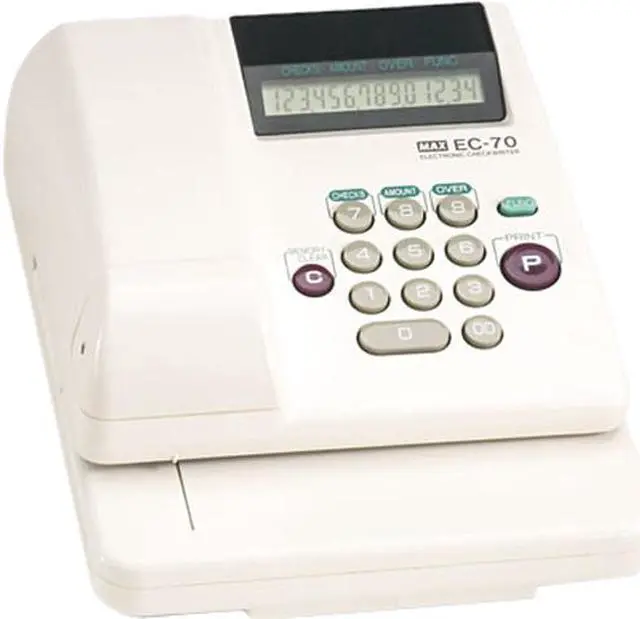 Embossed printing feature reduces the risk of alteration. Automatically inserts dollar signs, cent signs, commas and decimals. Prints original plus two copies (3-part check). Accepts business and personal-sized checks. Displays print amount on LCD screen for easy proofing and correcting. Clear key lets users fix errors before printing.