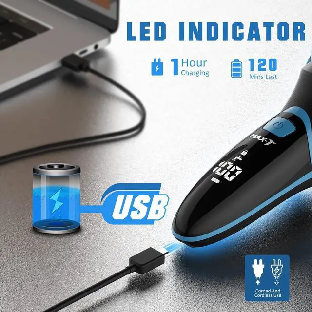 - MAX-T Electric Shaver Supports 60 mins USB quick charge for 120 mins continuous use, allows to using while charging, supports one-hand cordless operation, shave easily with one hand