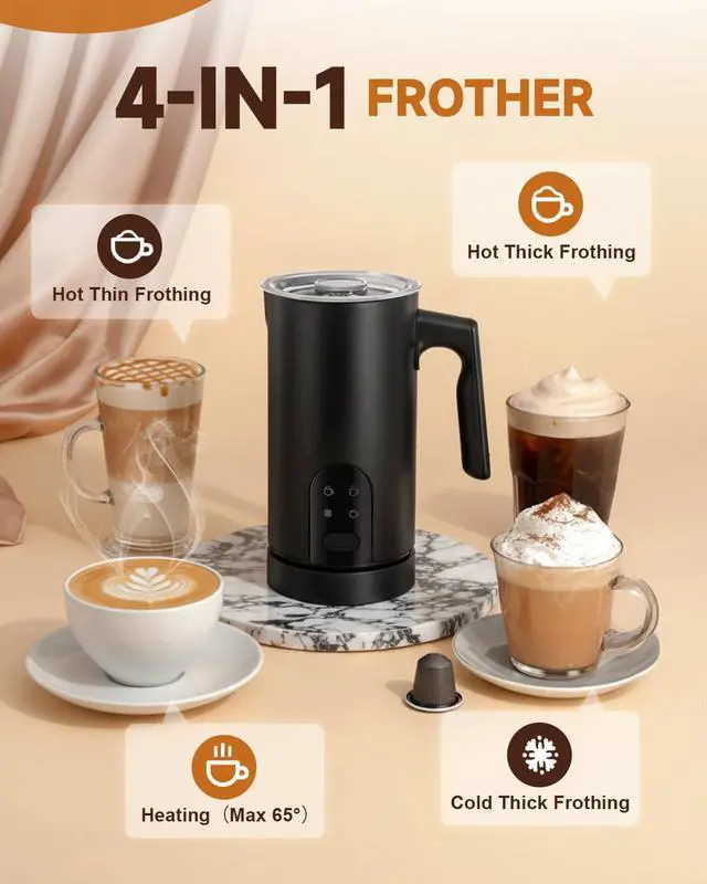 Ease of use- Simple LED control panel with 4 functions (big foam, small foam, hot milk, cold foam) even beginners master this milk frother electric in 3 minutes.