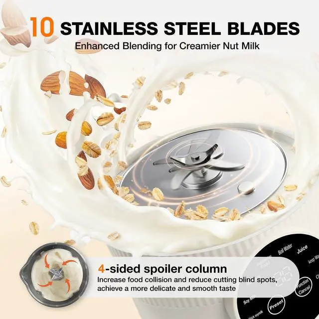 40 Oz Large Capacity|Food-Grade Stainless Steel & 10 Sharp Blades: Spacious food-grade stainless steel container with 10 durable stainless steel blades churns out enough plant milk to feed your whole family in one batch. Food-safe, sturdy materials ensure zero harmful contact with your drinks, so you can use it with total peace of mind.