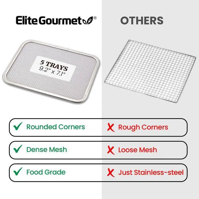 Spacious Stainless Steel Trays with Mesh Design: Includes five stainless steel trays, each measuring 9.2 x 7.1 inches with smooth, rounded corners for easier cleaning. The dense mesh pattern is ideal for drying smaller foods like herbs, nuts, or berries without falling throughmaximizing surface area for efficient dehydration across all five levels.