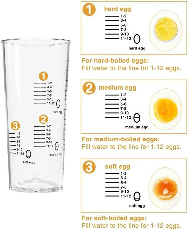 - Measuring cup with firmness markings makes it easy to cook to desired wellness - hard, medium or soft boiled eggs
