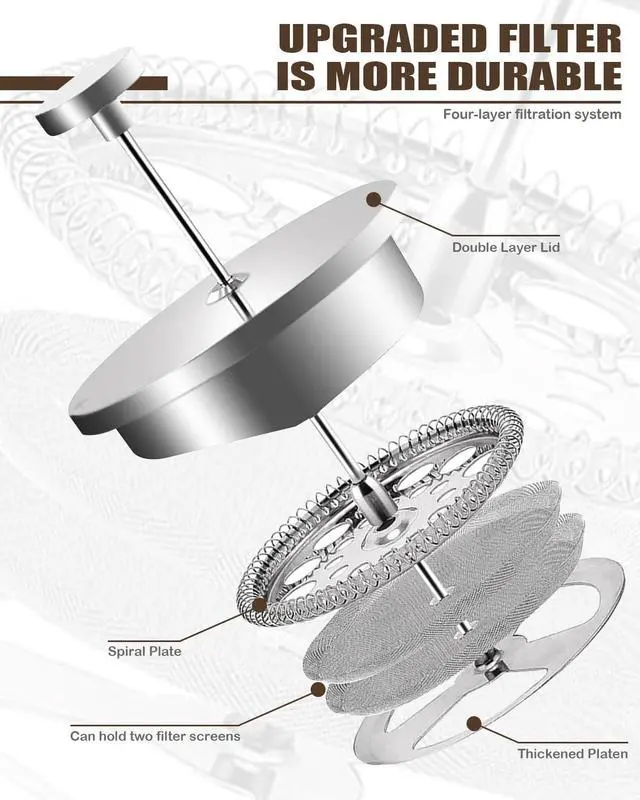 FILTRATION SYSTEM: Double-mesh stainless steel filter effectively separates coffee grounds from liquid while preserving essential oils