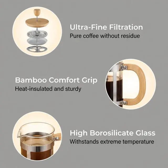 The french press is made of the heat-resistant borosilicate glass, stainless steel, and Disinfected bamboo. Thus, it will not be destroyed easily by hot or cold water.