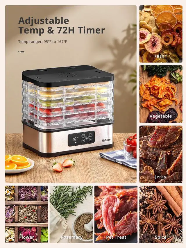 Precision Control for Perfect Results: Adjust time (1-72 hours) and temperature (95°F+) with intuitive digital controls to customize drying for fruits, vegetables, meats, herbs, and more. Includes preset guidelines for apples, bananas, beef jerky, and herbs in the manual.
