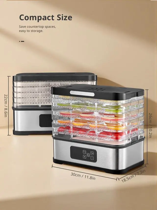 Large Capacity & Efficient Drying: Equipped with 5 removable trays, this dehydrator accommodates bulk drying while saving countertop space. The top-mounted fan ensures even heat circulation for faster, energy-efficient dehydration.