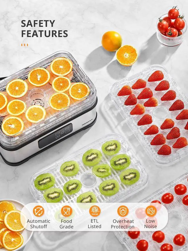 Durable Material: All 5 trays are made from food-grade BPA-free plastic, ensuring no harmful chemicals leach into your food. The sturdy stainless steel base resists rust, scratches, and heat damage, providing stable support during long drying cycles.