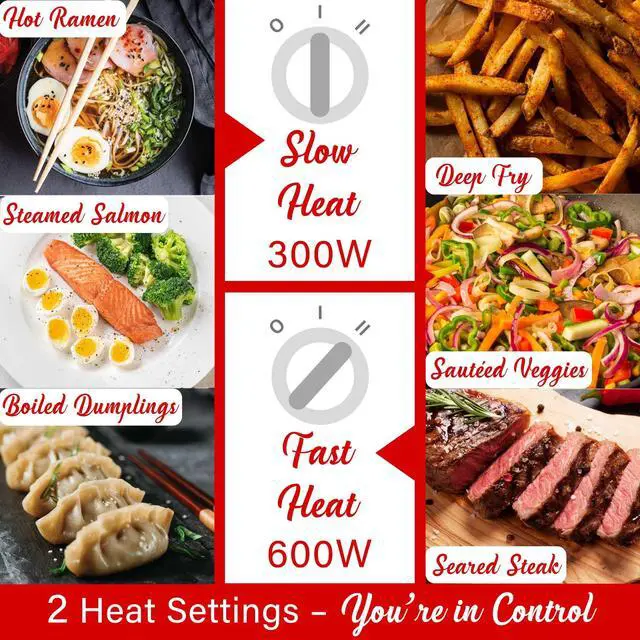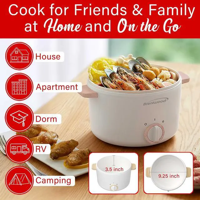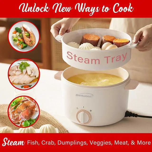 Use the 600-watt Brentwood(R) 3.2-Qt. Multi-Function Electric Hot Pot Cooker with Food Steamer to boil, fry, and saute fresh or frozen food and heat up leftovers. Prepare everything from authentic hot pot, ramen, and pasta to chicken, steak, eggs, and veggies. Deep enough to deep fry French fries, fish, chicken strips, mozzarella sticks, and more. Use the included steam tray to steam soft dumplings, healthy veggies, and more. Simply detach the power cable and use the large cool-touch handles to move this hot pot from kitchen to dinner table It's ideal for homes big and small - ranging from houses and apartments to dorm rooms as well as in hotel rooms and RVs. It features slow and fast heat settings, easy-to-clean non-stick ceramic interior, and vented tempered glass lid. Safely cook with this deep and wide hot pot, vented tempered glass lid, power indicator light, cool-touch handles, and overheat and boil-dry auto shutoff!