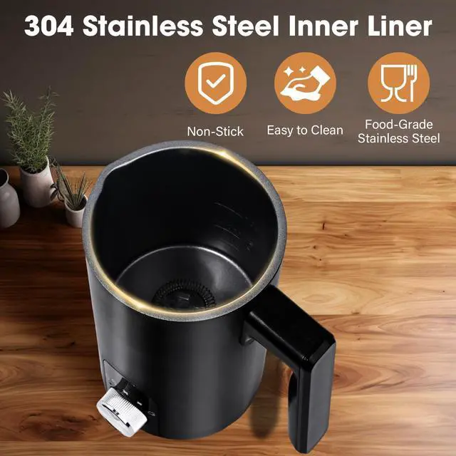 Easy Cleaning: The milk frother and steamer body are made of ABS material, and the inner liner is made of stainless steel with a non stick coating, effectively preventing residue. Also included is a cleaning brush for easier cleaning. When cleaning, remember not to get the bottom wet. Just wipe the body with a damp towel and clean the inside with a brush.