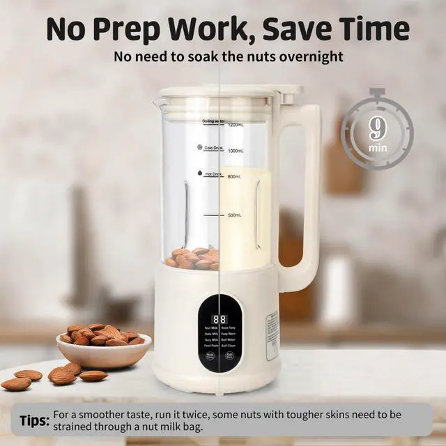 One-touch Automatic Program & VersatileWith our plant-based milk maker, you can skip the soaking process, it has 8 functions to meet your different requirements; The Room Temp function(104) is specially developed for almond and cold nut milk