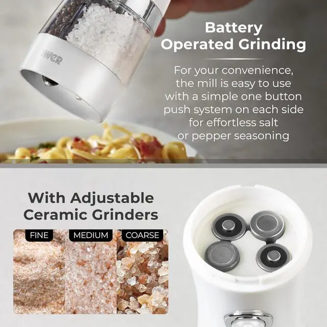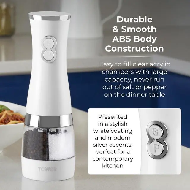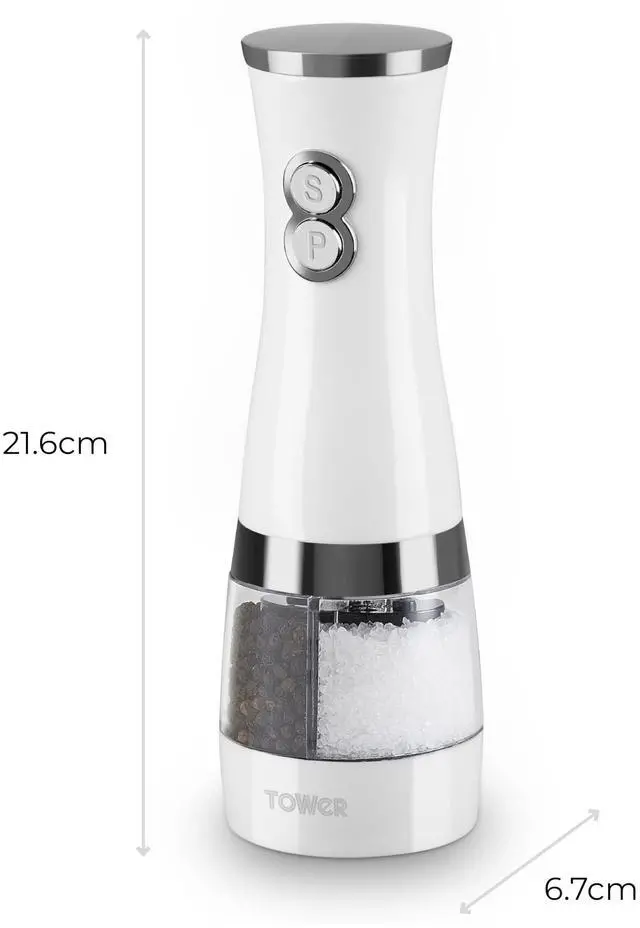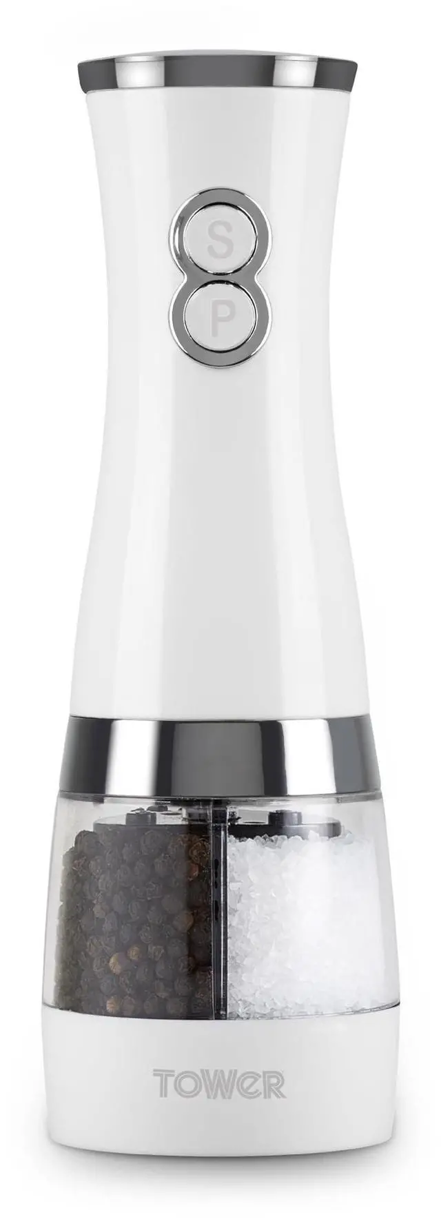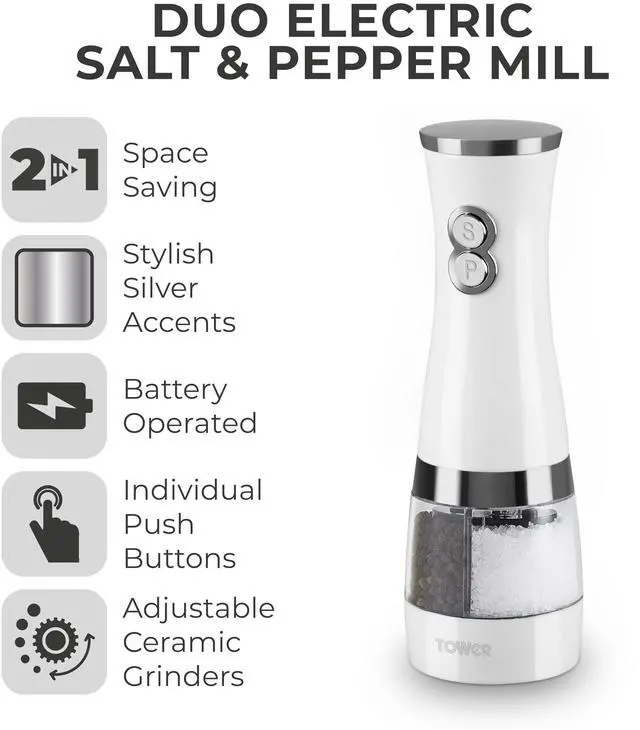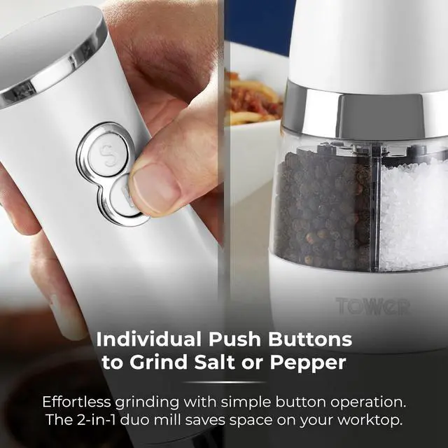 Towers electronic duo salt and pepper mill in black and white are a must-have essential for your dinner table. The elegantly designed duo mill includes a battery-operated mechanism that adds a touch of class to any evening meal. Featuring an adjustable grinder function, you can choose whether to have fine or coarse salt and pepper seasoning suited to your taste. The clear acrylic chambers in the main body offer viewing windows so you can keep an eye on the level of the contents for a top up and for added convenience. You only need to press a button for the mill to operate for effortless usage.