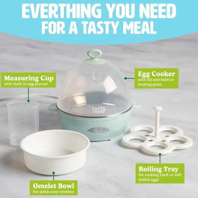 ALL-INCLUSIVE PACKAGE: The Tasty Egg Cooker comes with an omelet tray, 5-egg holder tray, and measuring cup with built-in piercer for perfect eggs.