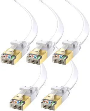 Maximm Cable CAT7 Flat Ethernet Cable, 5 Pack (White, 15ft) 10 Gbps, 600 MHz, Shielded RJ45 Gold Connectors Ultra-Thin Flexible Design for Home & Office Networking