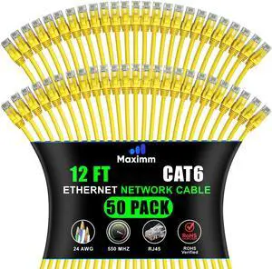 Maximm Cat 6 Ethernet Cable - 12 ft (50-Pack) - High-Speed LAN, Internet, Patch, and Network Cable - UTP, 10Gbps, 550MHz Ethernet Cord - Yellow