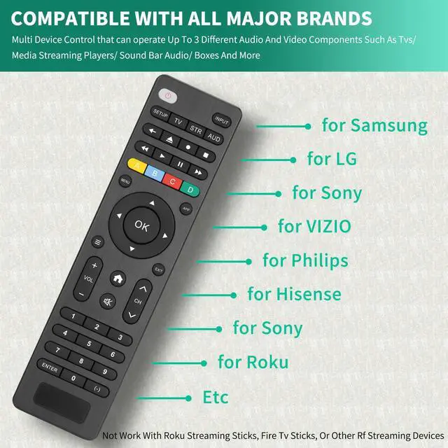 This Universal Remote Works With All Major Brands And Supports Thousands Of The Latest Audio/Video Equipment,compatible with Samsung,LG,Sony,Philips,Hisense,Insiginia,Toshiba,Emerson,Vizio,Roku Smart TVs and More Brands