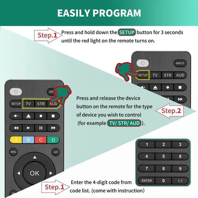 1.Press and hold down the SETUP button for 3 seconds until the red light on the remote turns on.2.Press and release the device button on the remote for the type of device you wish to control(for example TV, STR, AUD).3. Enter the 4-digit code from code list.(come with instruction)