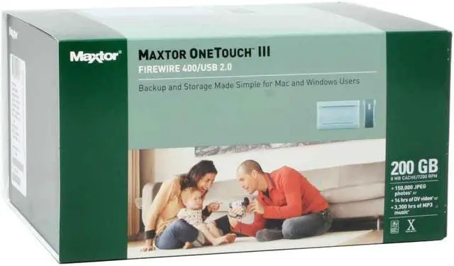 | Features | Maxtor OneTouch button—the easy way to make backup copies of your files Maxtor DriveLock protects contents of drive in case of loss or unauthorized use Simple Maxtor user-interface for drive management, security and backup scheduling System Rollback—rolls back your Windows PC system settings to a better point in time while keeping data current Synchronization of data between two or more computers Soft-touch over-mold enables stable grip for transport |