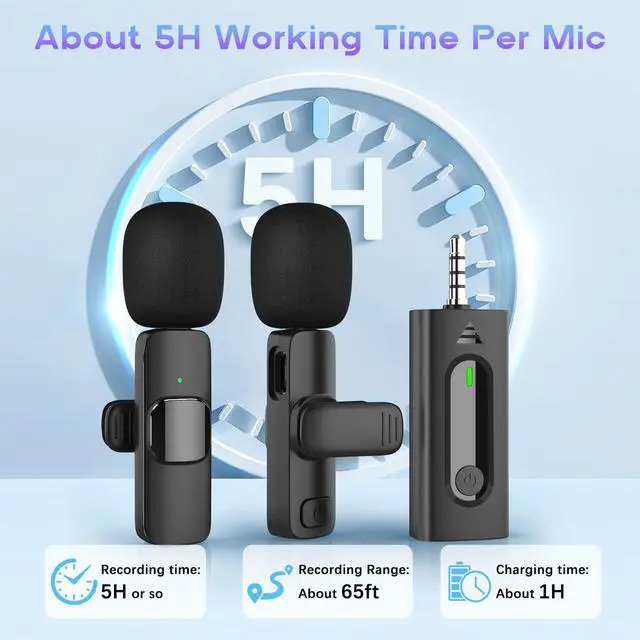 Build in 3.7V/65MAH rechargeable battery, the bluetooth lav mic can keep working up to 5H per mic and about 1H charging time only