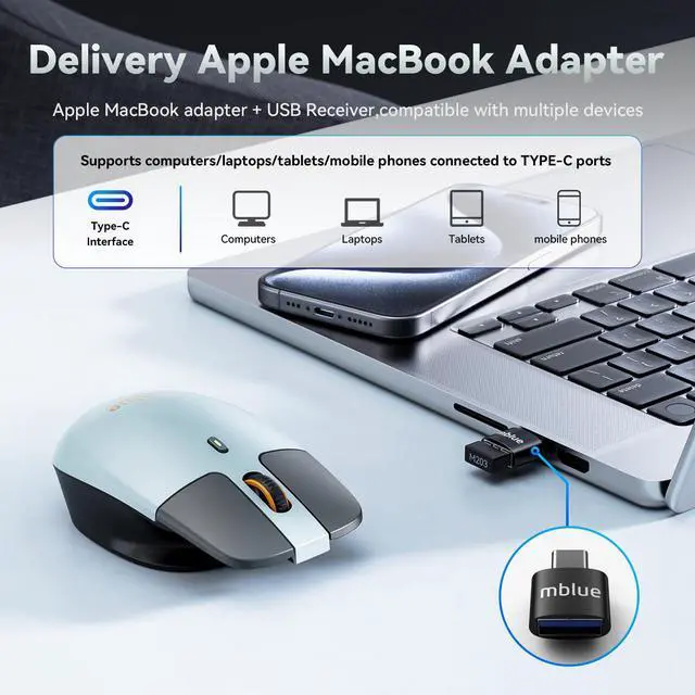 Our mouse box comes with a USB adapter and a Type-C adapter. Whether it's a phone, tablet, or computer, anyone with a Type-C adapter can use our mouse.For example, mobile phones,Tablets,Laptops,Computers,Mac mini, Mac Pro, MacBook Pro, Mac...........and so on.