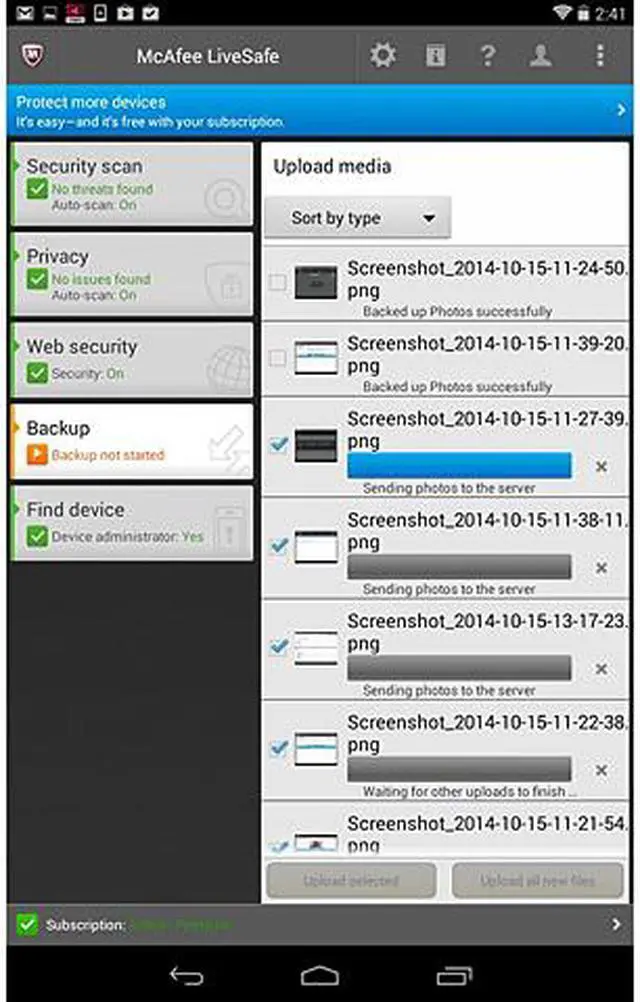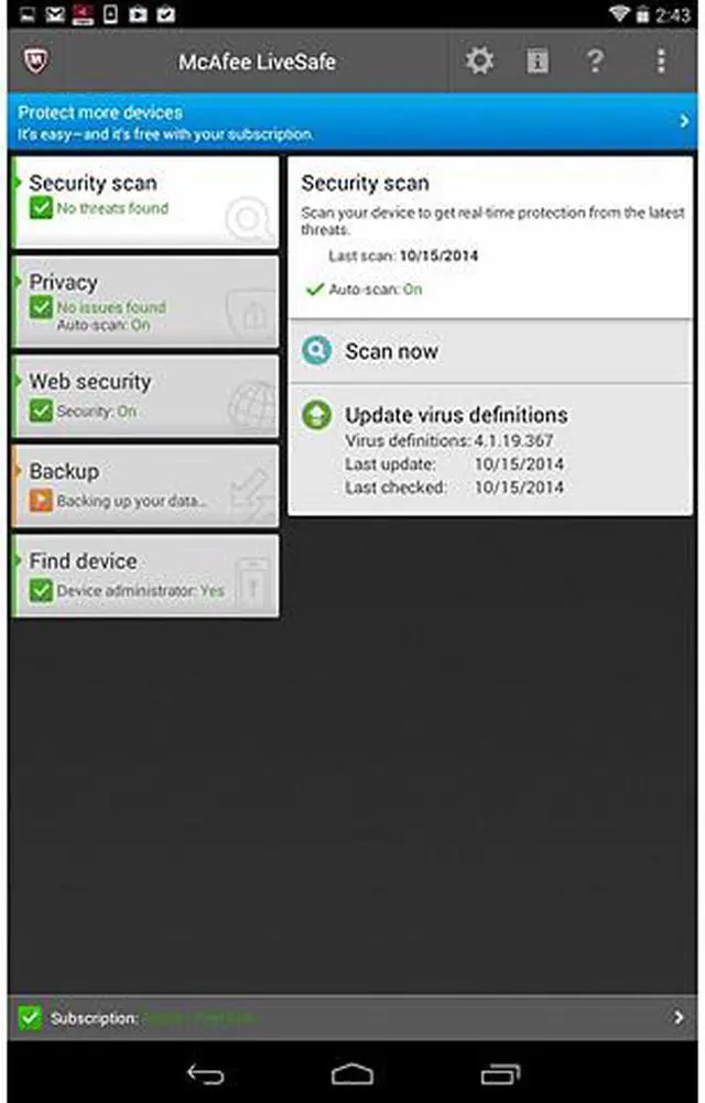 | Feature | Protect all your devices One subscription of McAfee LiveSafe covers an unlimited number of devices, so you can protect all the PCs, Macs, smartphones, and tablets you own - Secure all your PCs, Macs, smartphones, and tablets - One place to simply manage your devices - Easily add new devices Guard against viruses and online threats McAfee LiveSafe blocks viruses, malware, and the latest online threats from infecting your devices - Keep hackers and identity thieves from stealing your identity and data - Safely surf, shop, search, and bank online - Block spam and dangerous email Comprehensive Mobile Security McAfee LiveSafe safeguards your mobile devices from data loss and theft - Protect your data on a lost or stolen Android or iOS device with locate, backup, and wipe features - Real-time protection against mobile viruses and spam on your Android devices - Safeguard the data on your Android mobile devices against risky apps Password Manager McAfee SafeKey, a password manager included in McAfee LiveSafe, saves and remembers your online passwords - Easily and securely manage your usernames and passwords - Create unique and complex passwords for each online account - Works across all your devices and syncs automatically Secure Cloud Storage McAfee LiveSafe also comes with McAfee Personal Locker, which securely stores sensitive documents in the cloud that can only be accessed by your face and voice - Cloud storage that uses voice and face authentication so you, and only you, can access your files - Store personal documents like copies of your passport or ID, and easily access them while you are on the go - 1 GB of storage for your most sensitive documents |