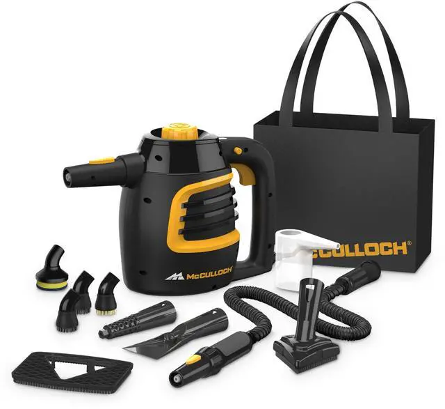 The McCulloch MC1230 Handheld Steam Cleaner is a multi-purpose steam cleaner for use outdoors and indoors. Using ordinary water heated to over 200ºF, the MC1230 effectively and naturally cleans a wide variety of surfaces. Includes 11 versatile attachments. Powerful steam and lockable steam trigger allow you to continuously blast through the task at hand. With over 50 years of experience in the design and manufacture of outdoor power equipment, McCulloch has established an unrivaled reputation for design, reliability, and value in a wide range of outdoor, garden and workshop products.