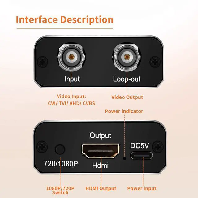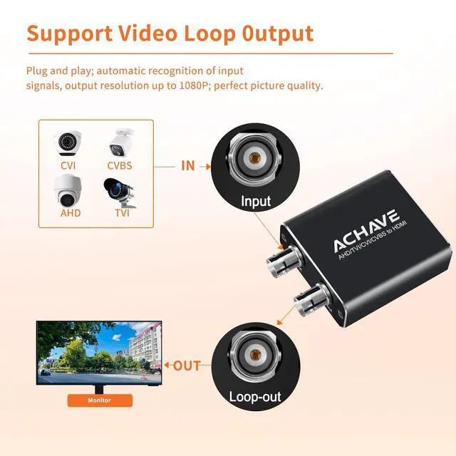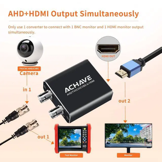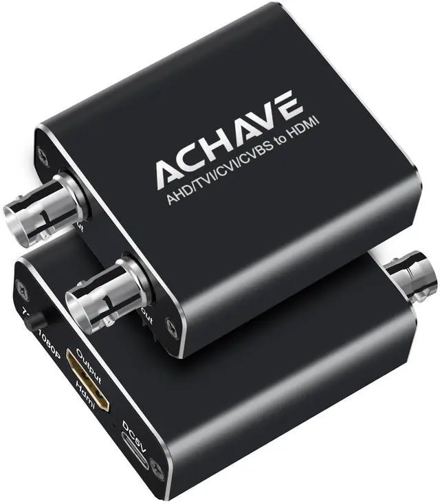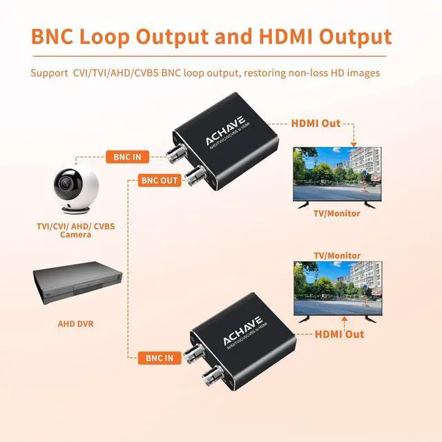 Transform your surveillance and monitoring setup with this versatile ACHAVE TVI/CVI/AHD/CVBS to HDMI converter. This powerful device seamlessly converts analog video signals to crystal-clear digital HDMI output at either 720P or 1080P resolution, selectable via an easy-to-use switch. The converter features both HDMI output and BNC loop-out capabilities, allowing you to connect multiple monitors simultaneously while maintaining excellent image quality. Supporting multiple input formats including TVI, CVI, AHD, and CVBS, this converter can handle resolutions up to 8MP (depending on input type), making it perfect for various applications from home security to commercial surveillance. The device maintains superior image quality with precise brightness, contrast, and color reproduction. It offers impressive transmission capabilities of 500-700 meters over coaxial cable, varying by resolution. The compact metallic housing ensures durability, while the 5V power supply (included) provides stable operation. Perfect for shopping centers, residential monitoring, elevator surveillance, and traffic monitoring systems, this converter combines versatility with reliable performance in a professional-grade package.