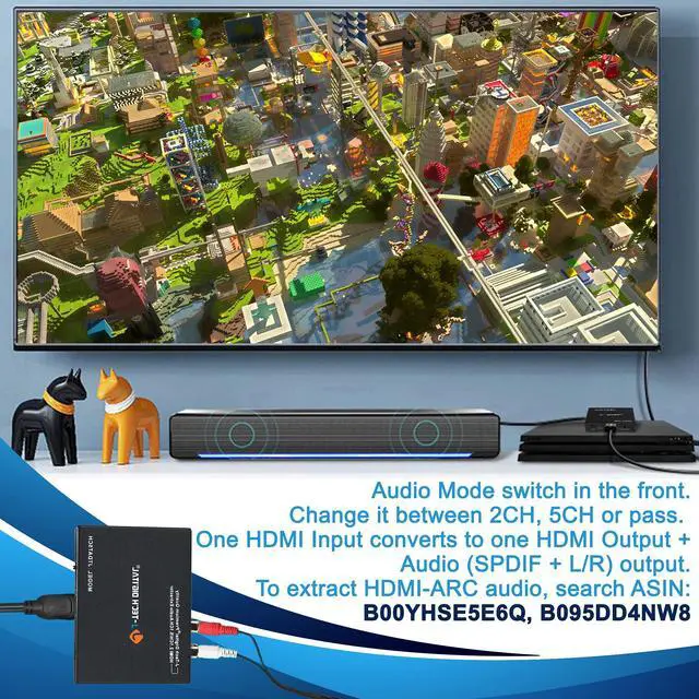 The J-Tech Digital JTECH-AT5CH-V2 UHD 4K@30Hz audio extractor allows you to extract audio via an incoming HDMI signal, and send it to an external sound system. The unit will pass the video to the intended display as desired. This device is perfect for users trying to use TV speakers along with headphones, or trying to send an audio signal to a legacy sound system that doesn't have the newer connection. Use the SPDIF Optical to send either 2CH or 5CH audio signal, or the RCA outputs to send 2CH audio signal to your sound system.