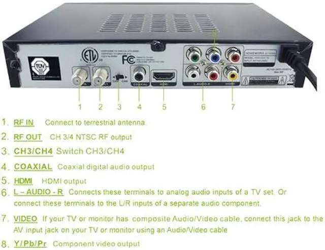 | Features | Converts Over-The-Air digital ATSC broadcast to your Analog or Digital TV, Projector, and Computer Monitor Karaoke Function: (Please download karaoke set up guide) Recording Function: Record TV Show (Suggest to use USB 3.5" External Hard Drive) USB Multimedia Player (Support USB Flash Drive up to 64GB, external hard drive up to 2TB) Output: RF Out, HDMI, Composite, and Component Output. Coaxial digital output. Audio / Video formats Support: Photo: JPEG, BMP, PNG Music: .mp3, .aac, .mp4 Video: avi, mpg, dat, vob, mkv, mjpeg (may not work with some video & audio codec format) Dolby Digital Audio Antenna out Analog Pass Through Channel 3 / 4 Function Parental Control Function Auto Tuning Close Caption |