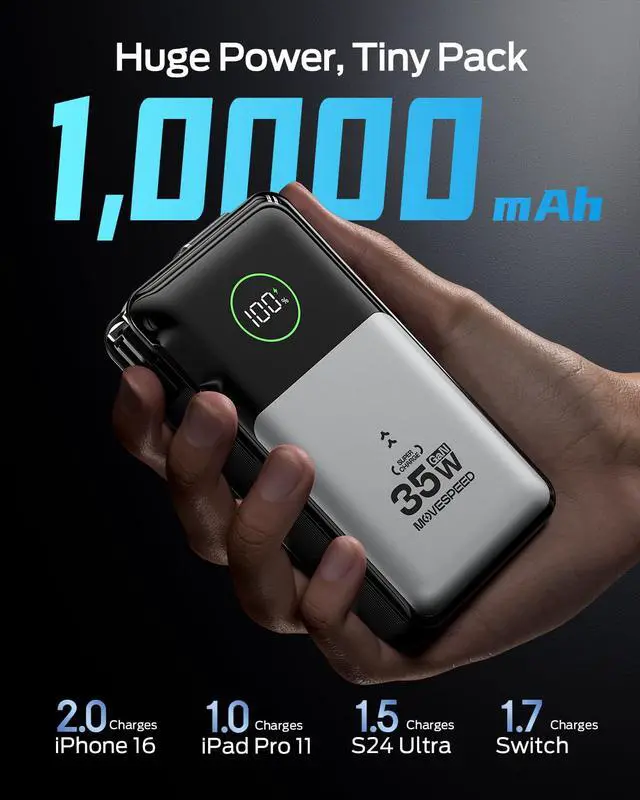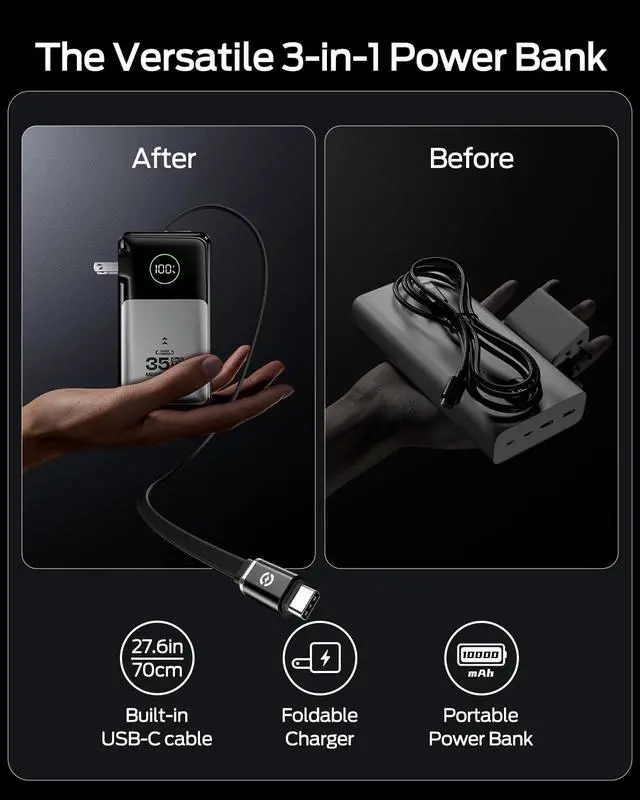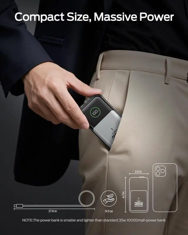 | Special features | 20W Wall Charger Mode: Travel Light and Replaces Your Wall Charger, 35W Power Bank Mode: Power Phones at Fast Speed, Anytime, Anywhere, Flight-Approved Power: Your Essential Travel Companion, Massive 10000mAh Power: Your All-Day Travel Energy Source, Tangle-Free 27.6" Retractable Cable: Pulls Smoothly, Stays Perfectly |