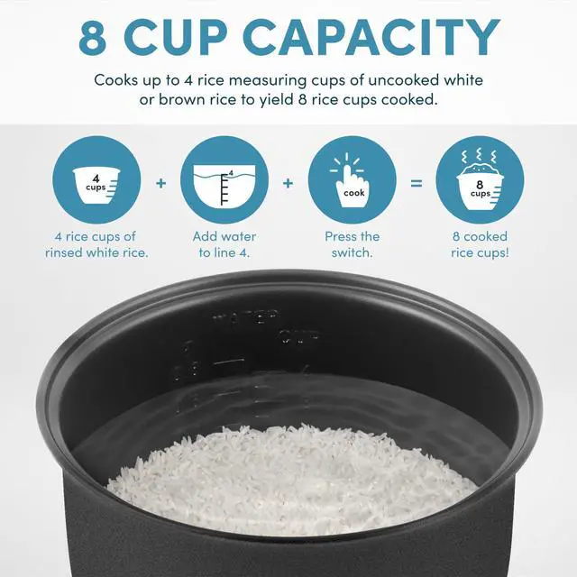 Elevate your home cooking with the _Mega Brand ® 8-Cup (Cooked) Digital Rice Cooker & Food Steamer. Enjoy restaurant-quality rice, wholesome steamed meals, and mouthwatering one-pot creationsall at the push of a button. The included Flash Rice function is perfect for those moments when you need rice in a flash. With this function, your rice will be ready in no time, simplifying meal preparation. Plus, it's dishwasher safe, ensuring stress-free cooking and easy cleanup. The compact design accommodates 2 to 8 cups of any rice variety, with specialized settings for White and Brown Rice. Once your rice is perfectly cooked, the cooker automatically switches to Keep Warm, eliminating the need for constant monitoring or stirring. The included steam tray lets you enjoy healthy steaming of meats and vegetables while your rice cooks below. And it's not just for riceuse it for oatmeal, chili, jambalaya, soups, and more. The Delay Timer caters to your busy lifestyle; simply set it in the morning, and return to perfectly cooked rice when you're ready to serve.