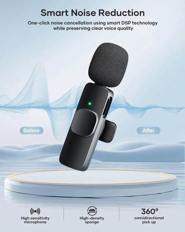 With easy plug-and-play setup, it connects wirelessly to your iPhone, offering up to 8 hours of uninterrupted recording time on a single charge. The microphone features advanced noise-canceling technology, capturing every word with precision while minimizing background noise. Ideal for interviews, podcasts, video shoots, and live streaming, this lavalier microphone delivers professional-grade audio in a portable design.