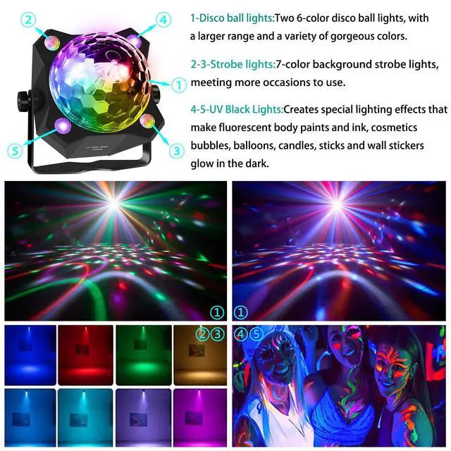 It consists of a 6-color disco ball and two colorful LED lights plus two UV lights the enlarged lampshade makes the range of light larger, the 6-color disco ball light can make the party full of vibrant atmosphere, whether it is a small gathering a large celebration event, this lamp will bathe the venue in vibrant lights, making every moment of the party more exciting and unforgettable.