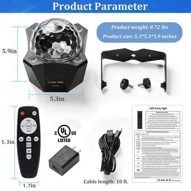 The disco ball light includes led party light x1, remote control x1, UL safety charger x1,ator x1, 10 feet USB cable x1, instruction manual x1: You can install the disco ball on the ceiling or place it on a table, we an additional 10 feet USB cable and a UL plug, which allows you to use it more conveniently in various occasions.