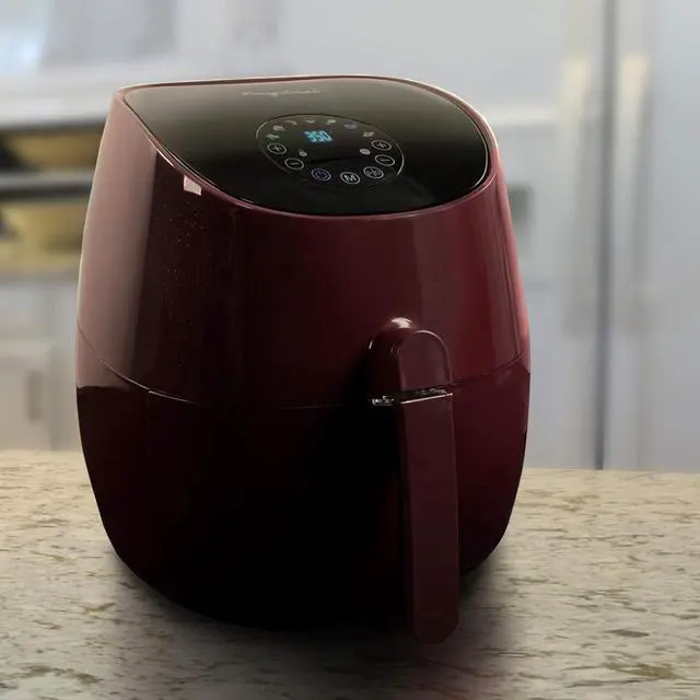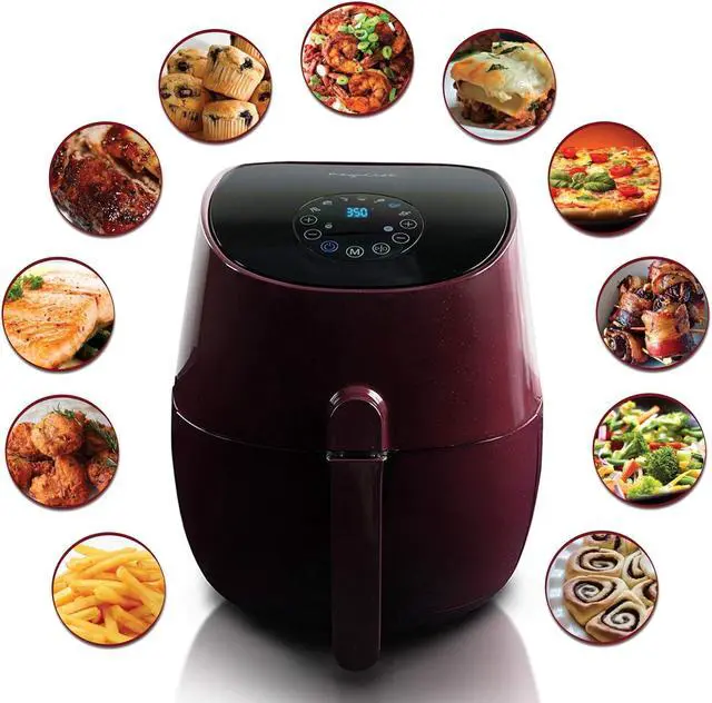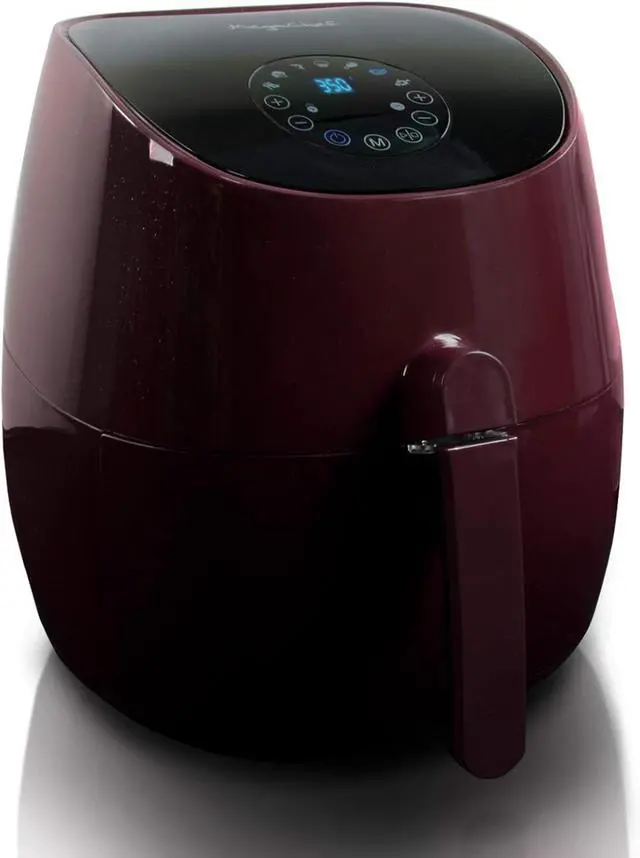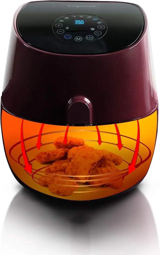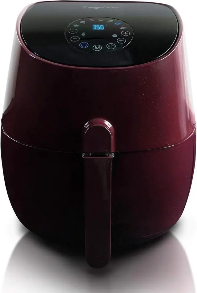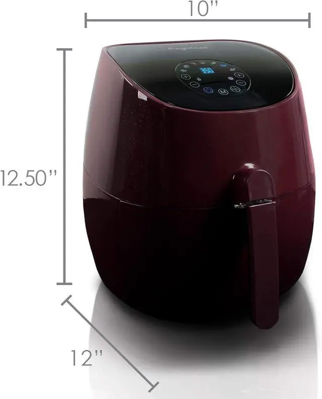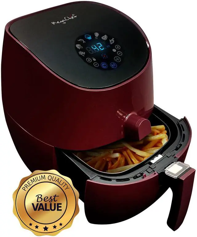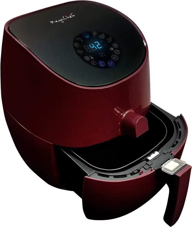 | Features | Enjoy tasty and healthy foods in style with the MegaChef 3.5 Quart AirFryer And Multicooker With 7 Pre-programmed Settings in Burgundy. The clean, rounded edges of this unit make it a stunning addition to your home and kitchen. Weather you plan to entertain or are preparing a warm meal for your closest family and friends, this unit won’t be the item you choose to remove from your counter-tops! The innovative hot-air circulation technology allows an even cooking of your food from all angles, which means you get crispier crunchier foods even with minimal cooking oils or completely oil free! This device will do much much more than fry, and with the growing popularity of these amazing items, you won’t soon run out of recipe ideas. Not only is it a healthier alternative, it will also spare you from dealing with unwanted odors in your home. During the cooking process, which the unit is securely closed, it emits very little of the aromas we’ve all come to expect on cooking days. The Digital Touch Panel makes it easy to operate your new AirFryer and Multicooker! There are even 7 pre-programmed cooking settings to ensure that your most popular fried foods can be made with ease and peace of mind. In addition, you have the ability to manually set your cooking program so that you have complete control of the cooking process. Fry, Roast and Bake your favorite foods hassle-free. Simply load the tray with your foods, choose a setting, and enjoy healthy and delicious meals in no time! The revolutionary technology of the MegaChef 3.5 Quart AirFryer And Multi-cooker offers you a faster cooking process, resulting in juicier and healthier foods. |