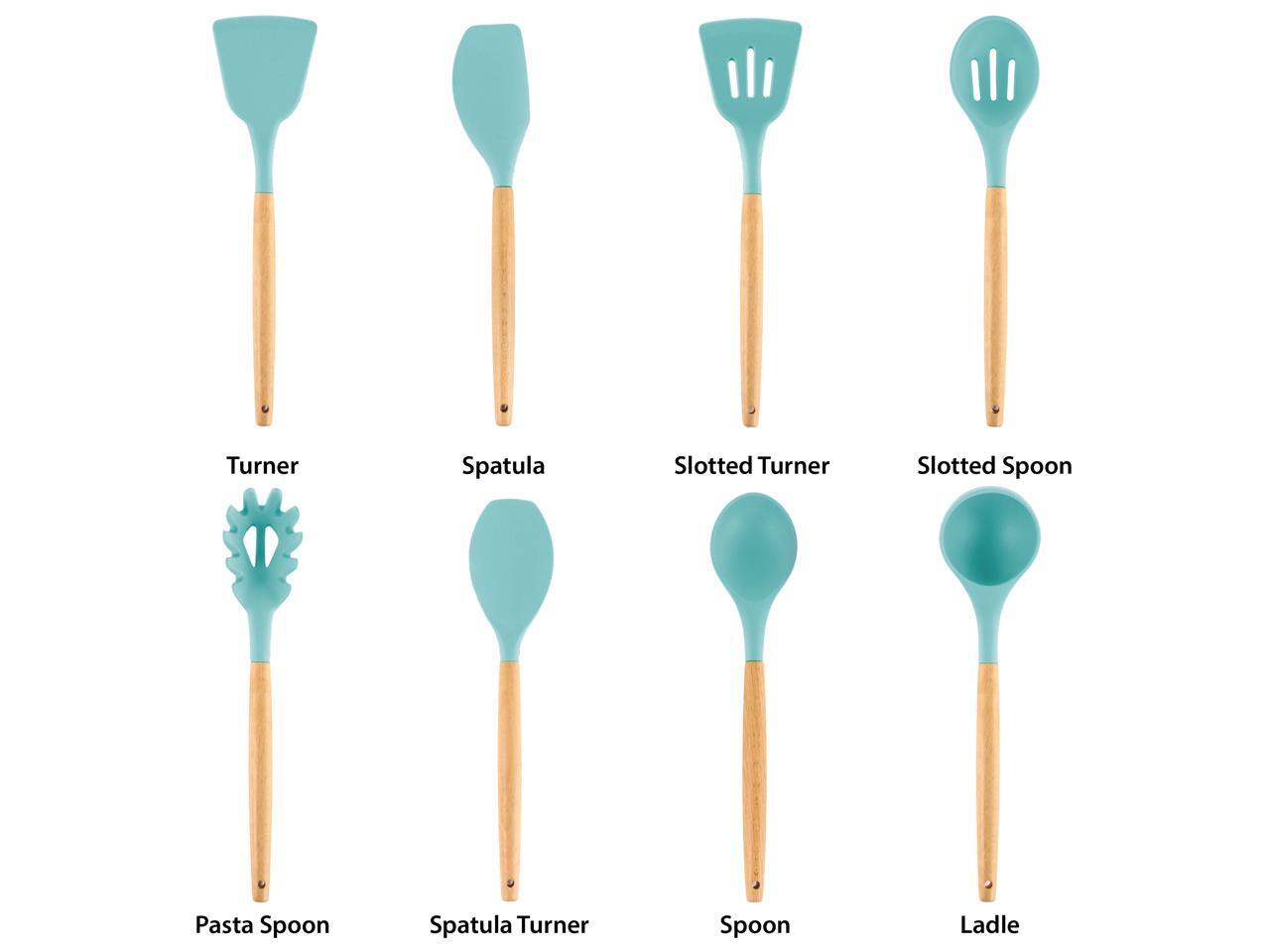 - Set includes a slotted turner, a turner, a spatula turner, a spatula, a pasta spoon, a ladle, a slotted spoon and a spoon.