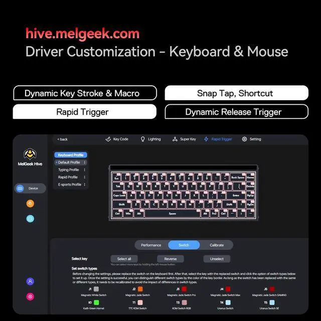 • Smart web & Software Ecosystem: The HIVE firmware enables macro programming, DKS (Dynamic Keystroke Strategy), and SnapTap anti-jitter, with OTA updates for future features like TGL/MT modes.