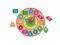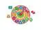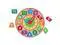 Teaches fine motor skills, numbers, colors, shapes, and concepts of time