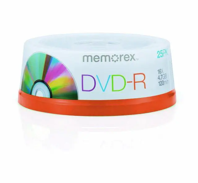 25 PACK Memorex DVD-R 16X Discs with 120 Minutes, 4.7GB of Data per disc. Features up to16x Recording Speed. Packaged in Cakebox Spindle.