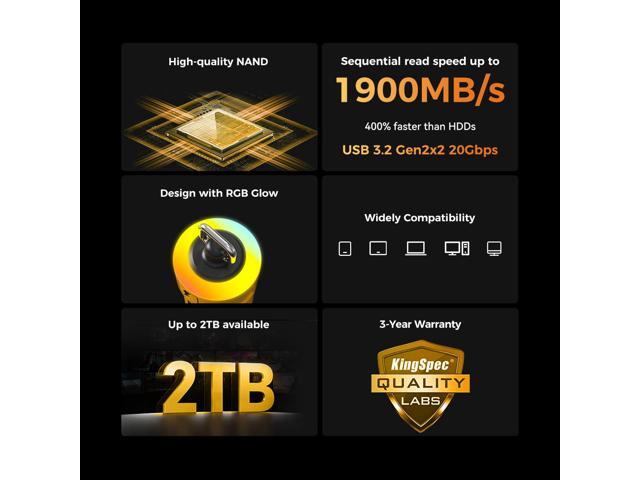 - · Lightning-Fast Data Transfer: KingSpec's External SSD offers blazing 20Gbps speeds and up to 1900 MB/s for lightning-quick data transfers. (On Macbook,the speed may drop.)