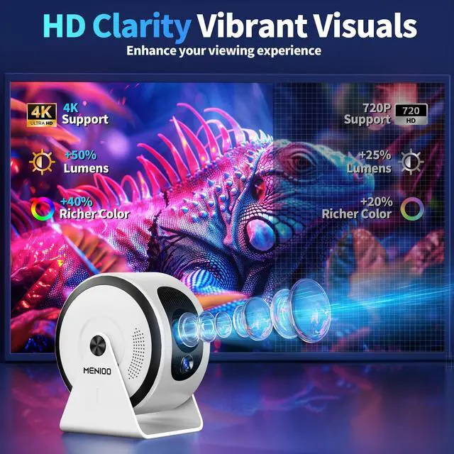 [Mini Projector Supports 4K] MENIOO projector 4K adopts the new generation of LCD light source technology, with a native resolution of 720*1080P, supports 4K HDR video playback. The 2026 upgraded projector further enhances this with 200 lumens brightness and a 10,000:1 contrast ratio, delivering rich, true-to-life colours. HDR delivers richer, more lifelike images by capturing, creating and displaying a wider range of brightness levels and colour depth. Its short-throw technology brings vivid, large-screen viewing into every room effortlessly achieving a cinema-grade immersive experience.