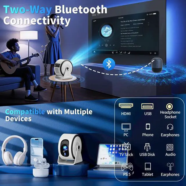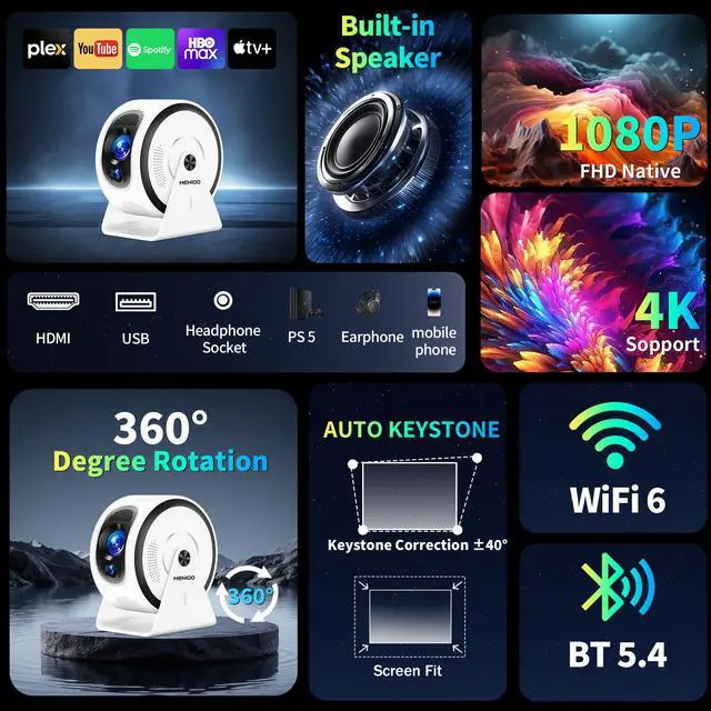 Mini Projector [Built-in Apps] Projector 4K 1080P, 2026 Upgraded Auto Focus & Auto Keystone 360° Rotatable Projector Portable with WiFi 6 & Bluetooth 5.4 Compatible with HDMI/TV Stick/USB/Laptop,White