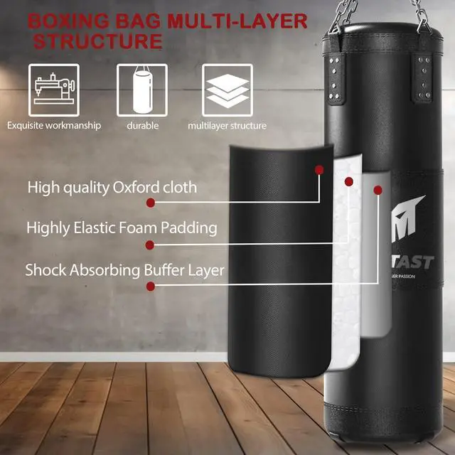 | Included Components | 1 x 4ft punching bag(unfilled),1 x 12oz boxing gloves,1 x pair of hand wraps,1 x rotation,4 x expansion bolt,1 x connecting carabiner,1 x boxing bag hanger,1 x jump rope,1 x grip strength trainer,1 x boxing reflex ball |