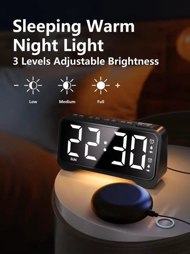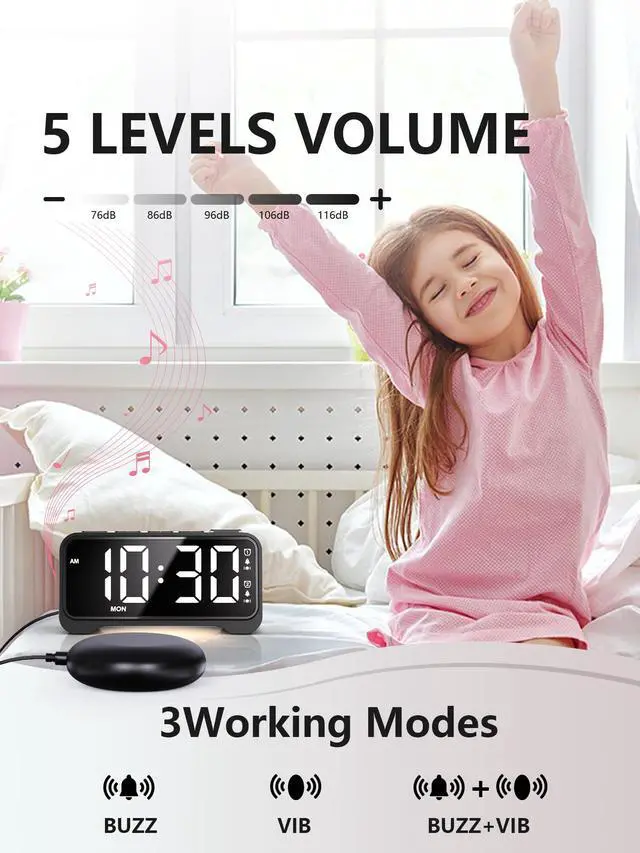 Wake Up Loud or With a ShakeThis bed shaker alarm clock features 3 wake-up modes: buzzer, vibration, or both. With 5 volume levels and 3 vibration strengths, its ideal for heavy sleepers, teens, and users with hearing impairment. Wake up your wayno sound needed.