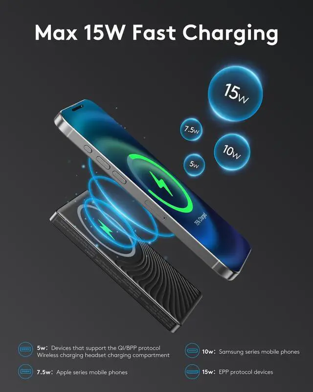 This power bank supports wireless charging at 15W, 10W, or 7.5W, depending on the maximum supported power of your phone. Additionally, the USB-C output supports wired charging of up to 20W.